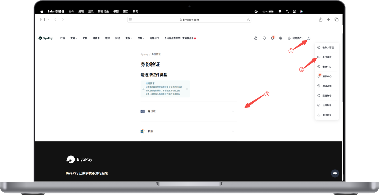 点击网页右上角头像图标,进入个人中心,点击【身份认证】,选择【身份证】或者【护照】认证