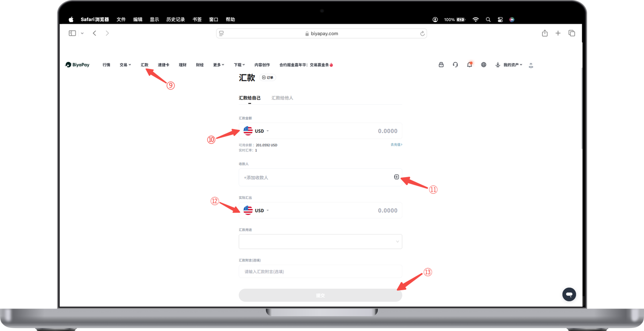 2、【汇款】页面,选择汇出USD,实际汇出USD,选择收款人账户,输入邮箱验证码或者Biya验证器码进行提现。