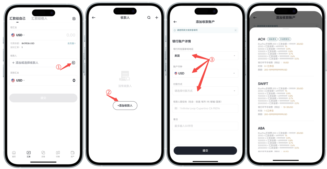 BiyaPay支持本地和国际汇款。当您绑定收款银行账户时,可以查看具体支持的汇款方式,具体信息以绑定时显示的为准。