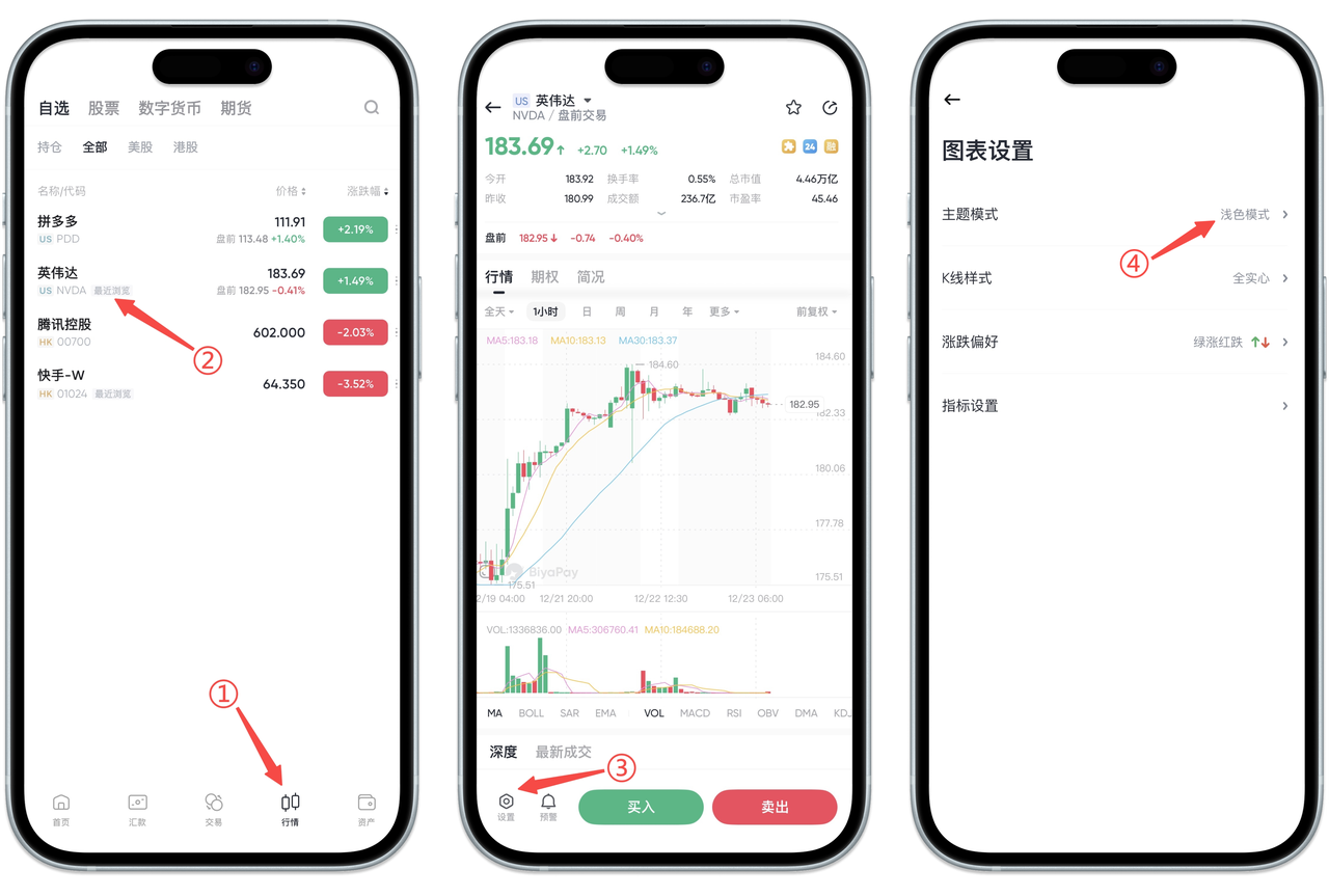 如何在 App 端设置股票图表页面深色浅色: