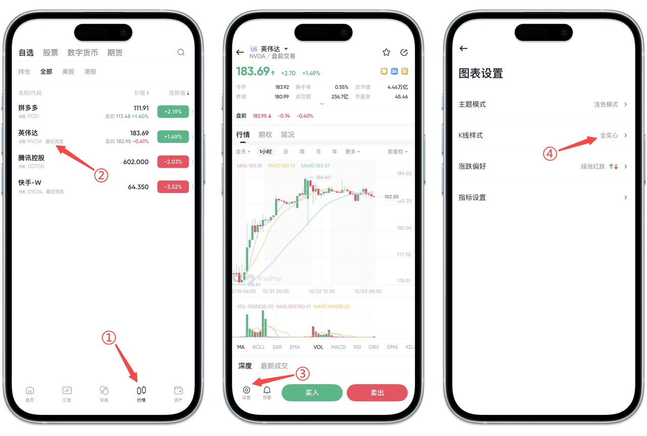 如何在 App 端设置股票K线样式: