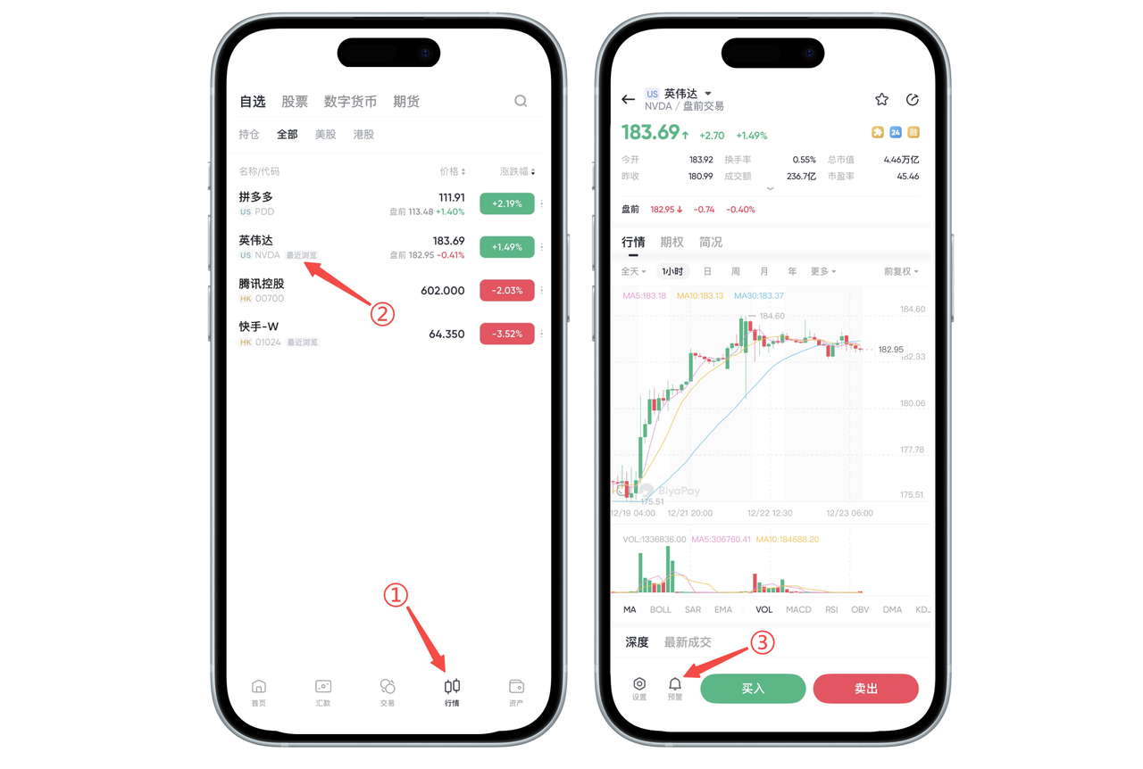 1、在【行情】页面,点击您需要交易的股票,进入股票图表页面后,点击图表左下角的【预警】按钮,