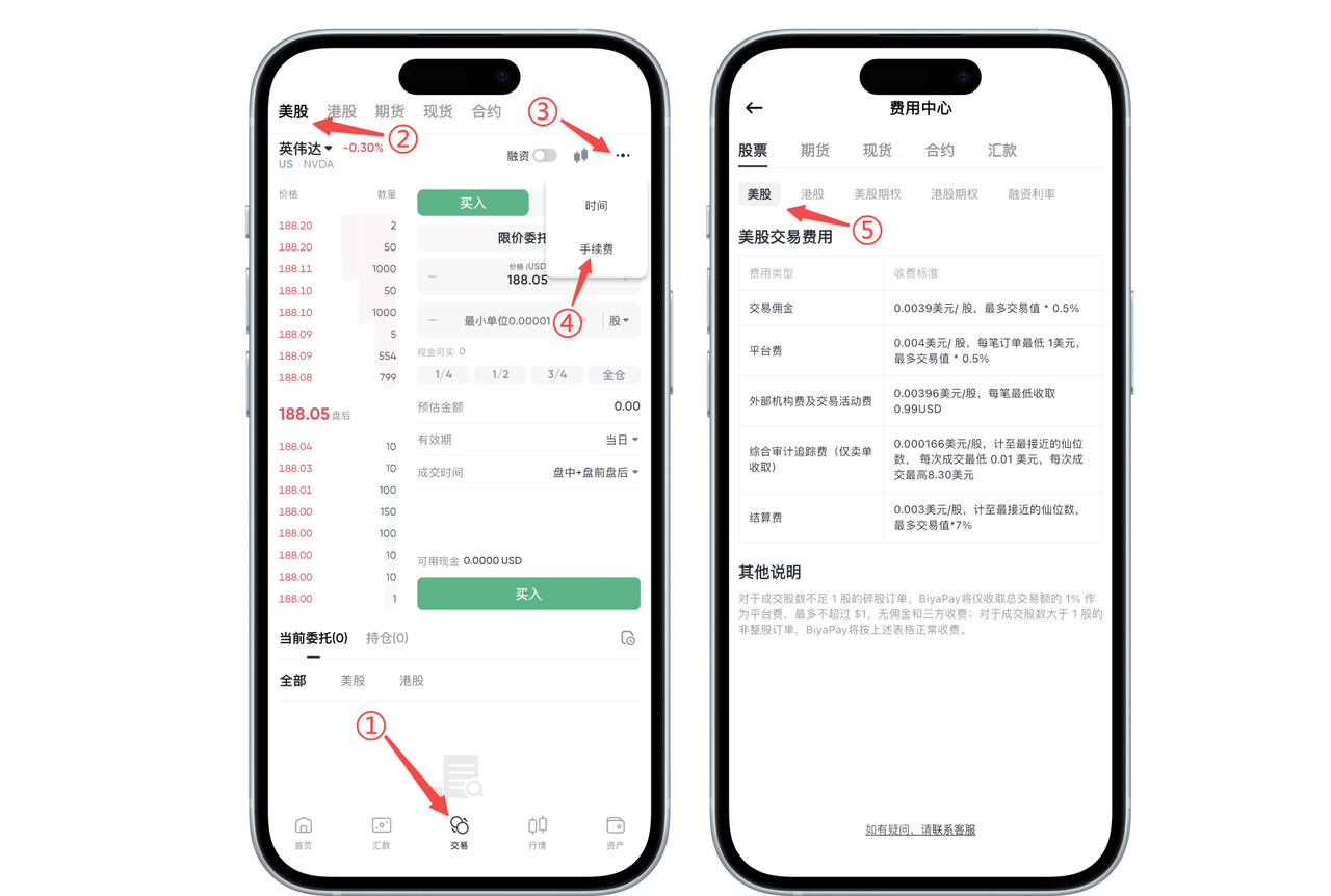 如何在 App 端查看美股手续费收费标准: