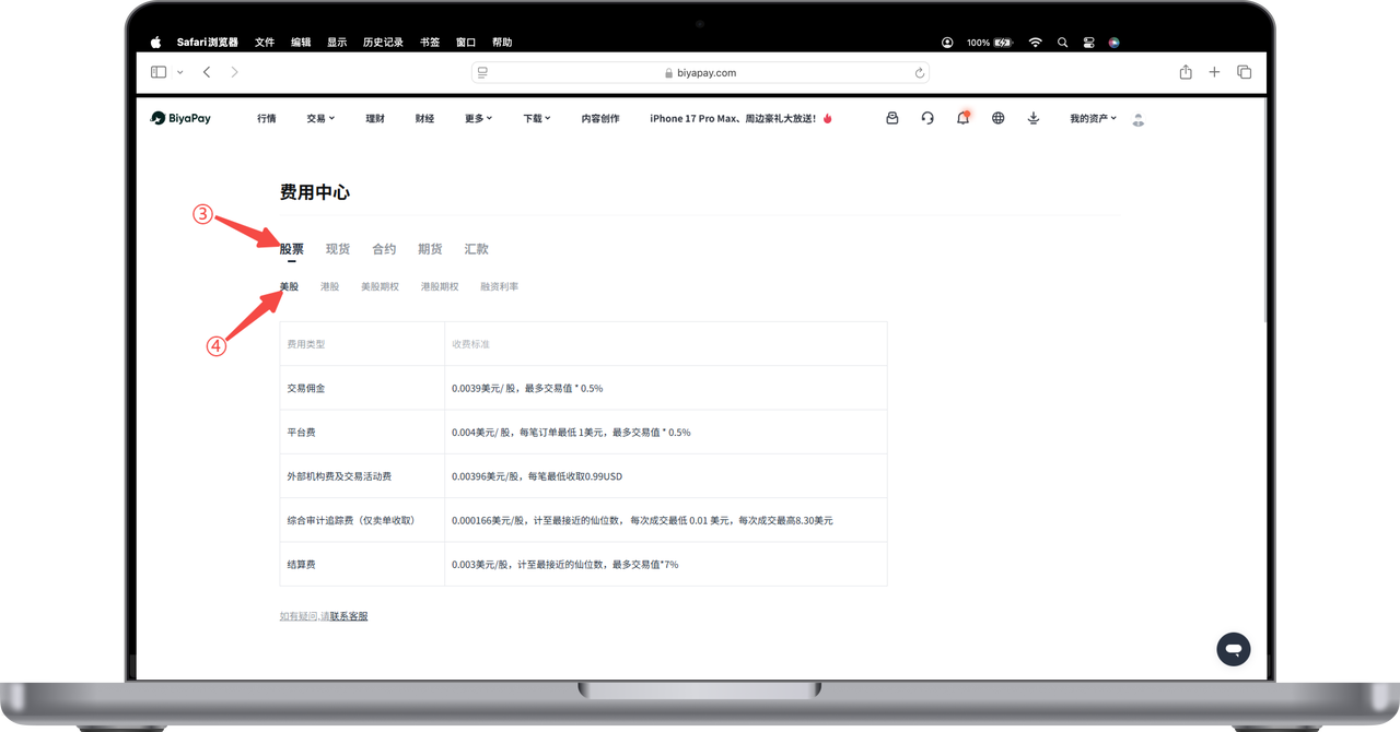如何在 Web 端查看美股手续费收费标准: