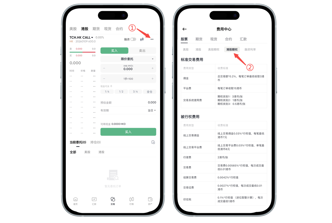 如何在 App 端查看港股期权手续费收费标准: