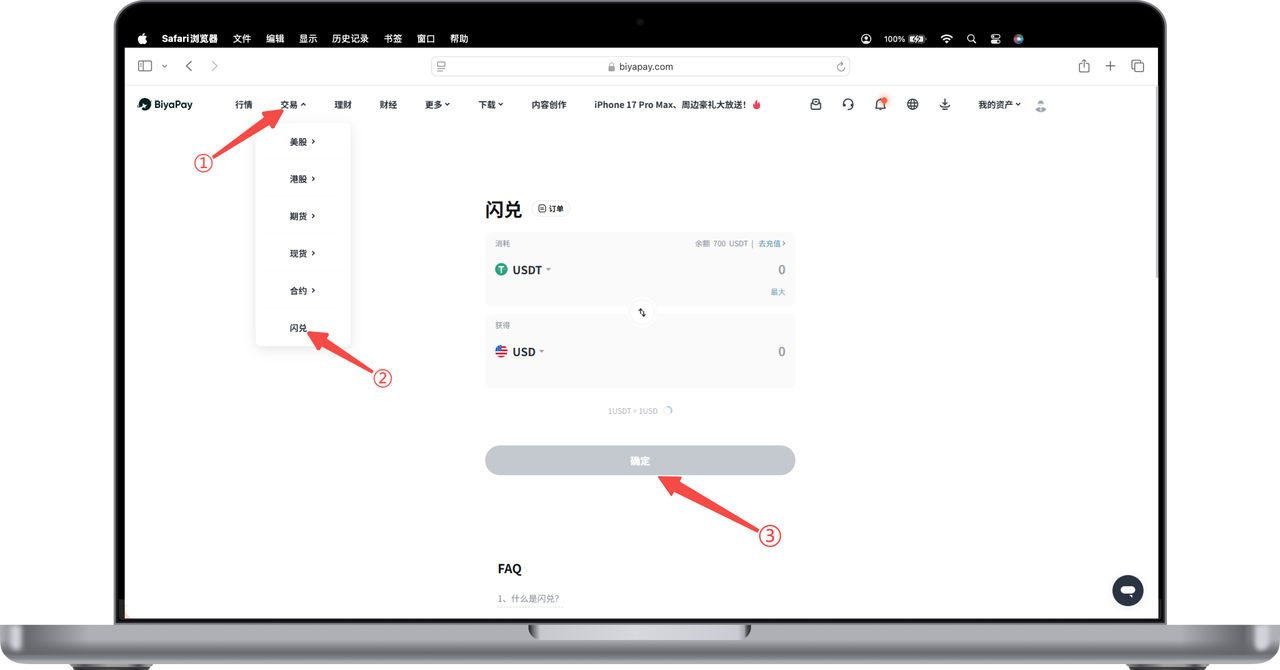 数字货币充值到账以后,您需要先把数字货币闪兑成法币美元或者港币(下图示例为数字货币USDT闪兑法币USD,再把USD从资金账户划转到股票账户),您点击网页左上角【交易】-【闪兑】,在闪兑页面把USDT闪兑成USD,