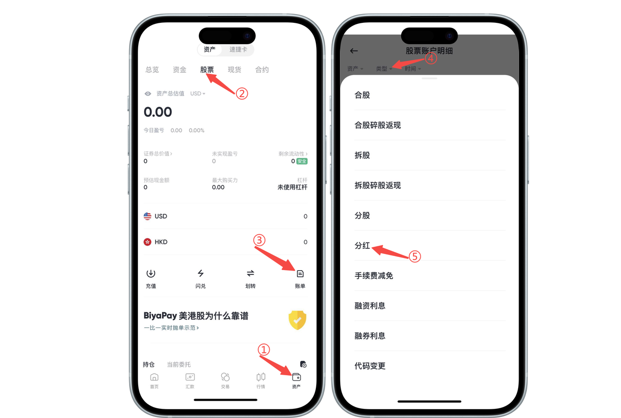 在【账单】页面,选择【分红】,即可查看股票分红记录。