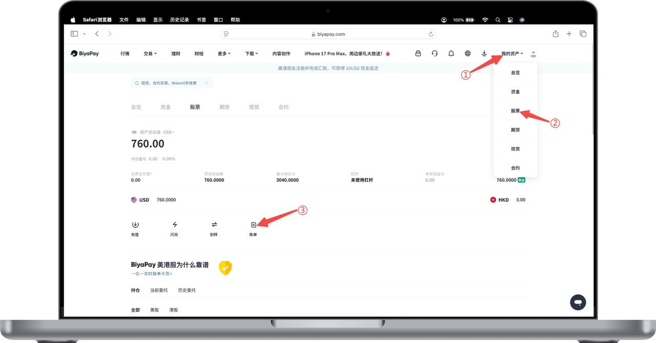 您点击网页右上角【我的资产】-【股票】,在股票页面点击【账单】,
