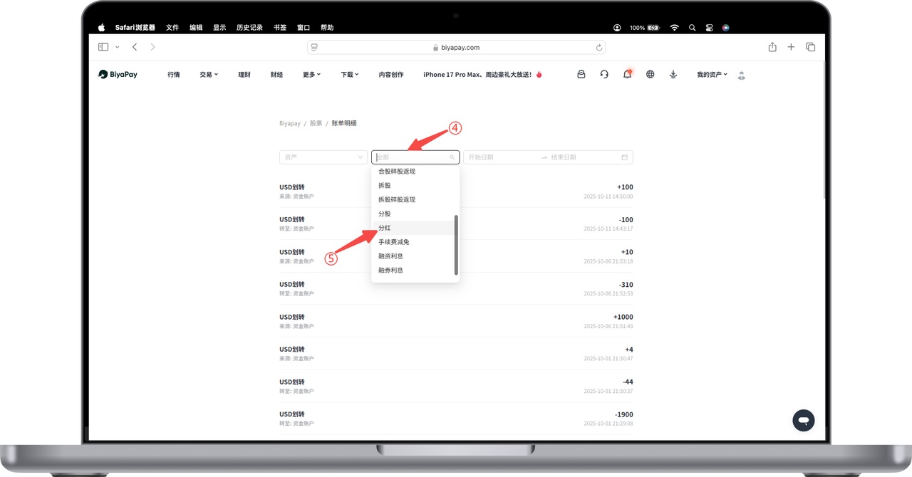 您在【资产】-【股票】页面点击【账单】,进入【股票账户明细】页面,选择【类型】,找到【分红】,即可查看到历史股票分红金额记录。