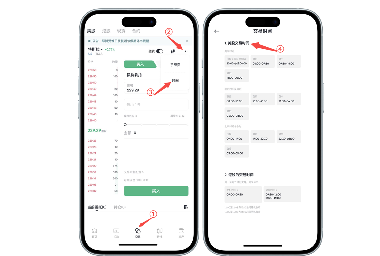 您可以点击股票【交易】页面右上角的三个小点,查看美股交易时间