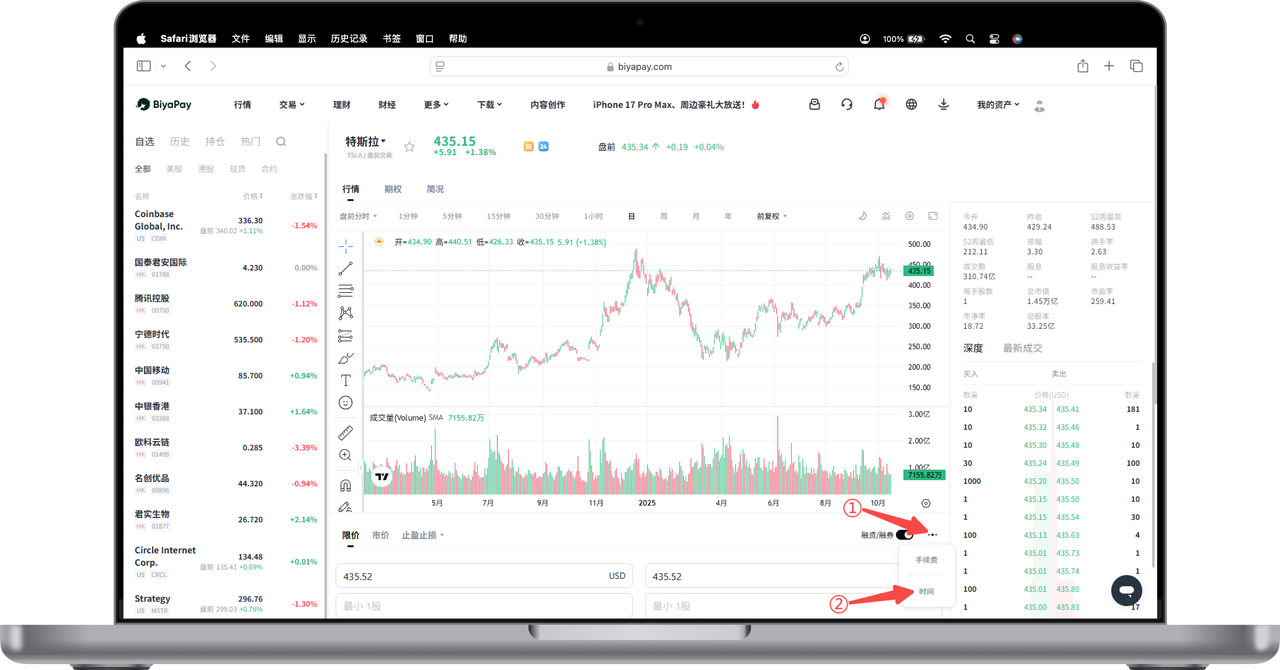 您可以点击股票【交易】页面右下角的三个小点,选择【时间】