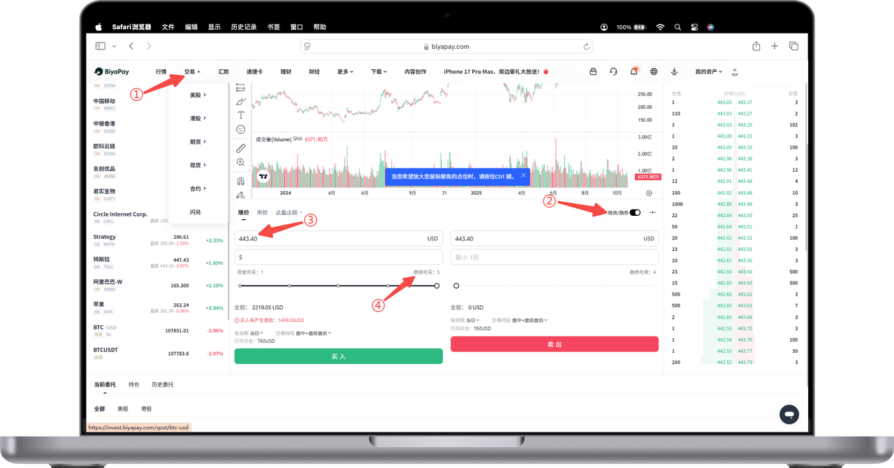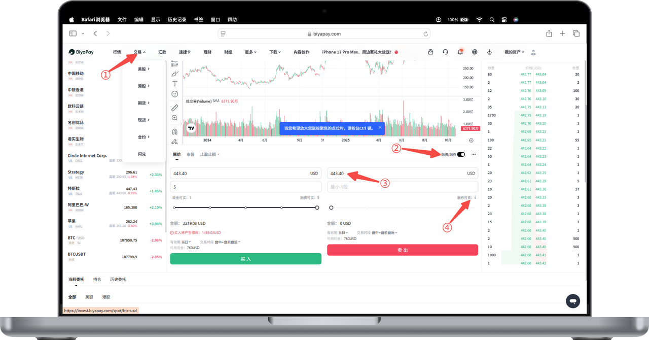 融券交易最多可以卖出多少股票,同样也取决于股票的初始保证金率和您账户的资产情况。当您账户内的自有现金不足时,BiyaPay将自动根据您的账户资产情况(包括但不限于现金、持仓、冻结资金等),向您提供融券,以维持足够的抵押金额。最多可卖出股票数量,在填入卖出股票价格,可以看到【融券可卖】数量,若本身没有该股票的多头持仓,选择卖出则可以进行融券交易。