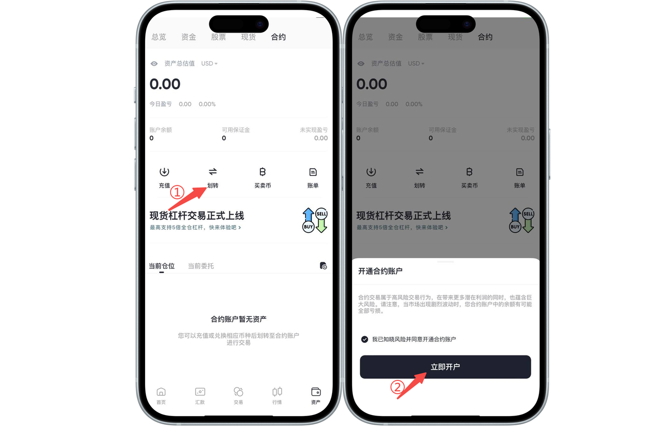 如何在 App 端开设数字货币合约交易账户: