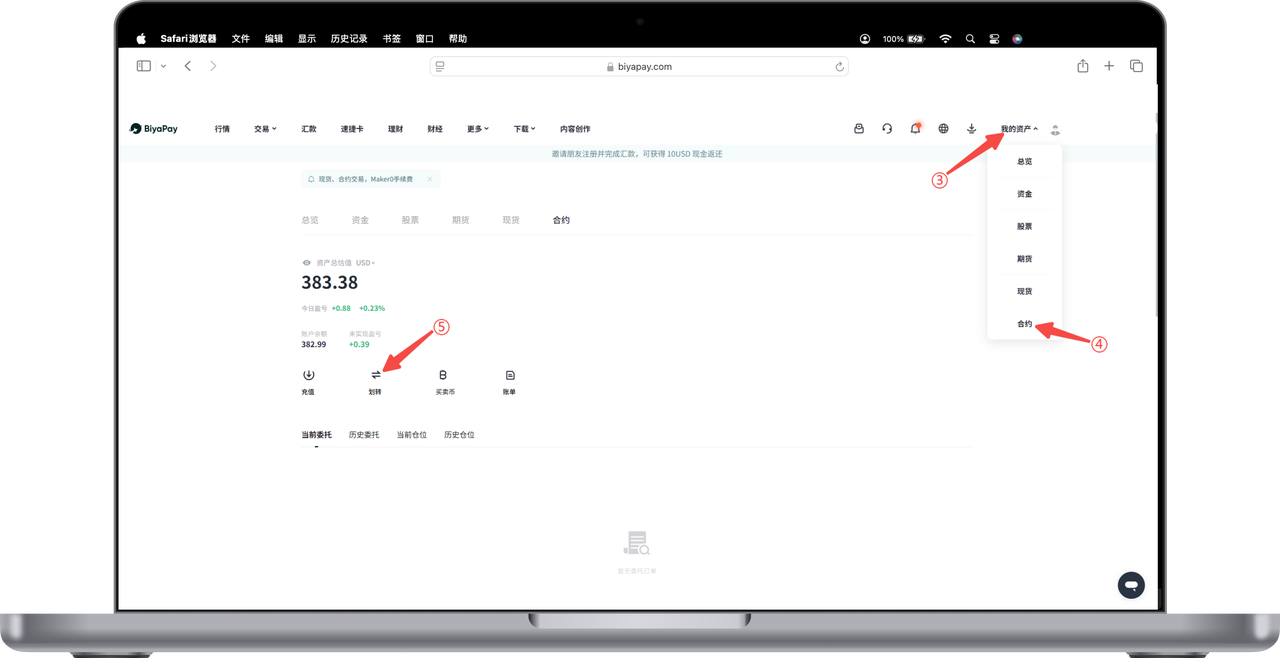 2、点击网页右上角【我的资产】-【合约】页面,在合约页面点击【划转】,弹出【开通合约账户】的页面,点击【立即开户】,您就开设了一个 BiyaPay 数字货币合约交易账户。