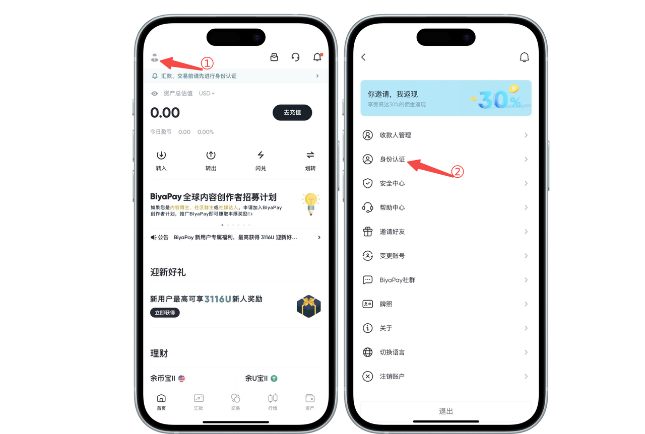 点击app首页左上角头像图标,进入个人中心,选择【身份认证】完成实名认证