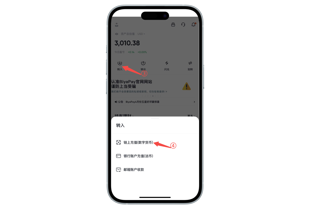 app首页点击【转入】,选择【链上充值】,充值USDT