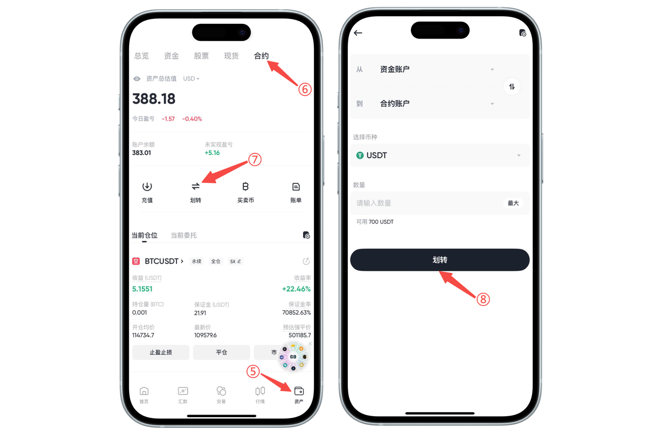 点击【资产】-【合约】页面的【划转】,把USDT从资金账户划转到合约账户