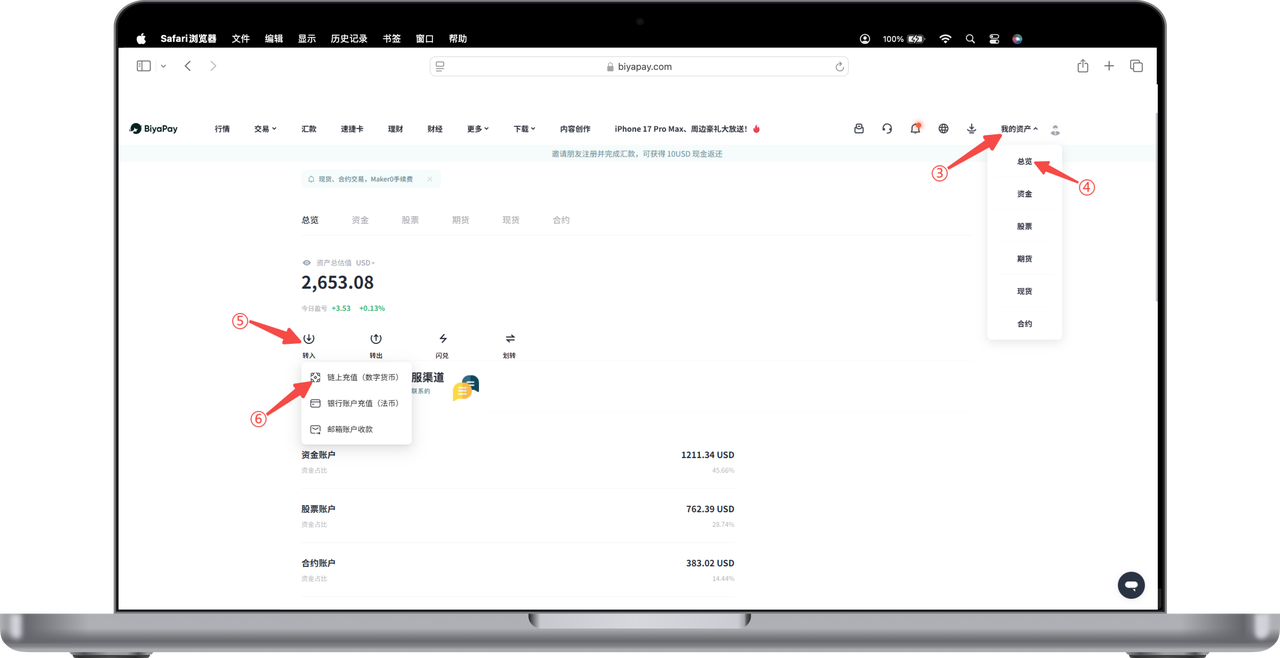 点击网页右上角【我的资产】-【总览】,在总览页面选择【转入】-【链上充值】,充值USDT