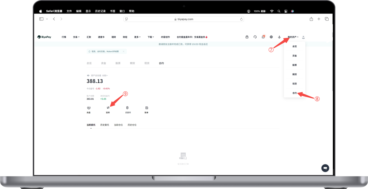 点击网页右上角【我的资产】-【合约】页面的【划转】,把USDT从资金账户划转到合约账户