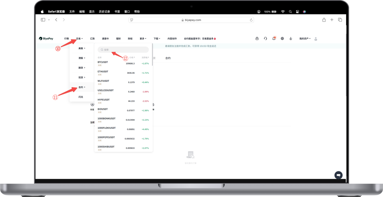 点击网页左上角【交易】-【合约】页面,选择或者搜索币种进行交易。