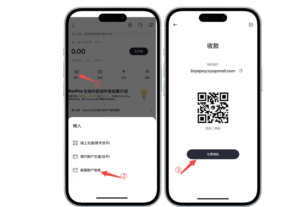打开App首页,点击【转入】—【邮箱账户收款】,复制或者分享地址给对方,对方通过【转出】—【邮箱账户转账】给您的BiyaPay账户转入资产。对方通过【邮箱账户转账】给您转账以后,您的BiyaPay账户可以实时收到对方转入的资产。
