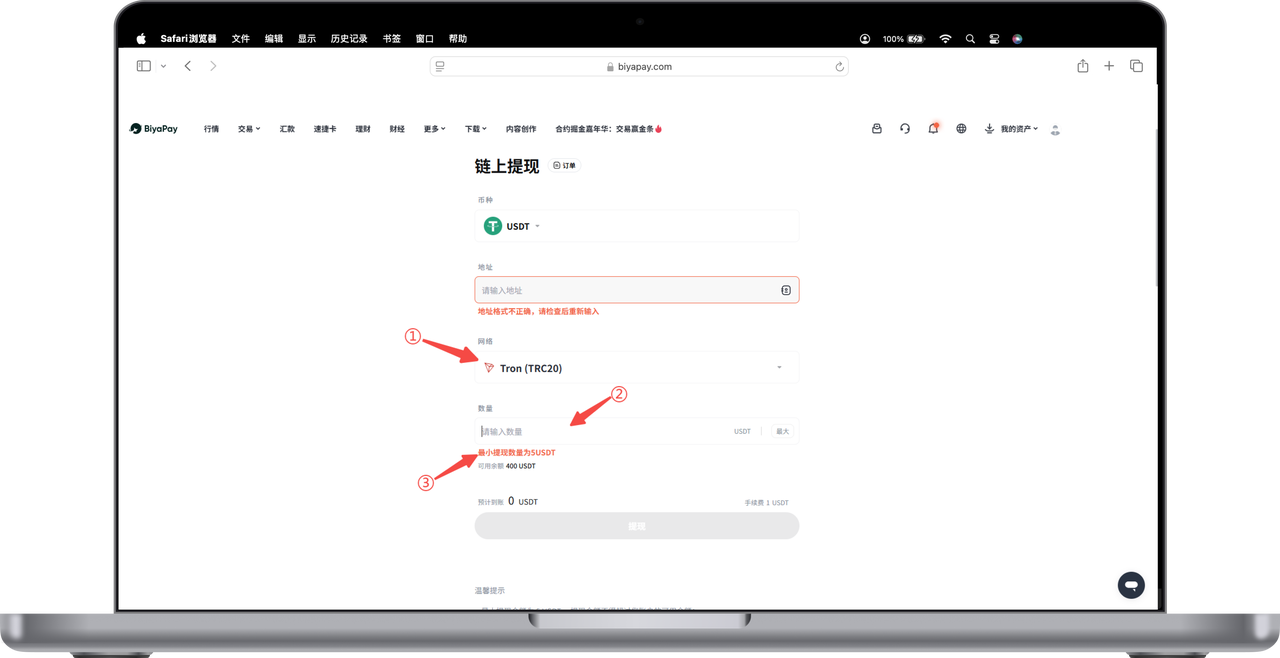 如何在 Web 端查看提现数字货币最低金额: