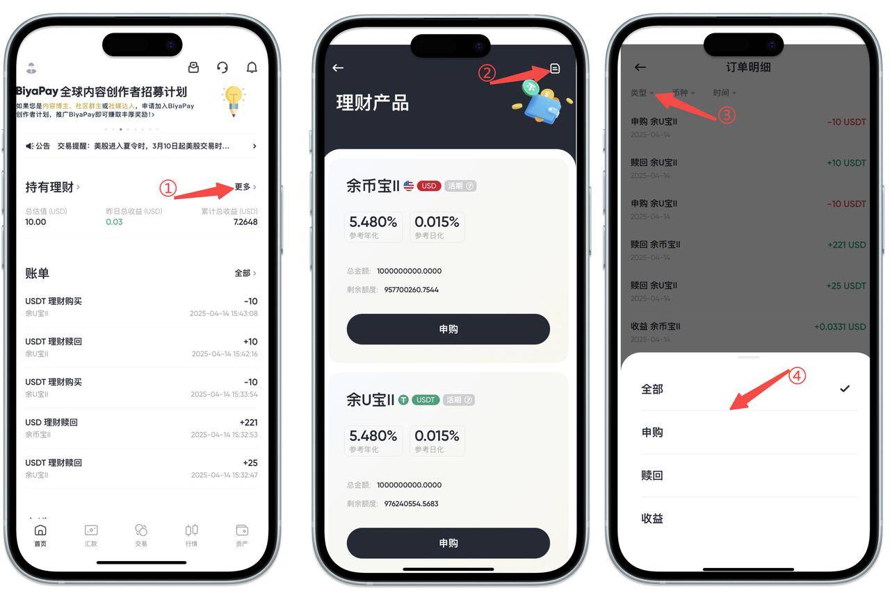点击持有理财页面右侧的【更多】,再点击理财产品页面右上角的【记录】图标,在订单详情页面里查看理财购买、利息、赎回记录以及详情。