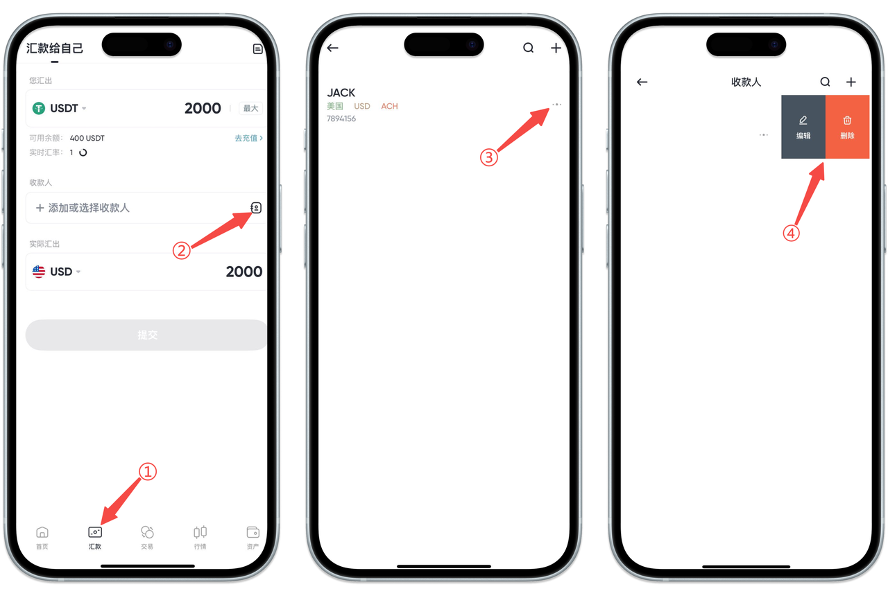 在【汇款】选择【添加或者选择收款人】,然后点击收款人右侧的三个小点,即可删除或者编辑收款人账户。