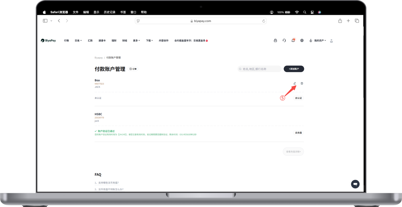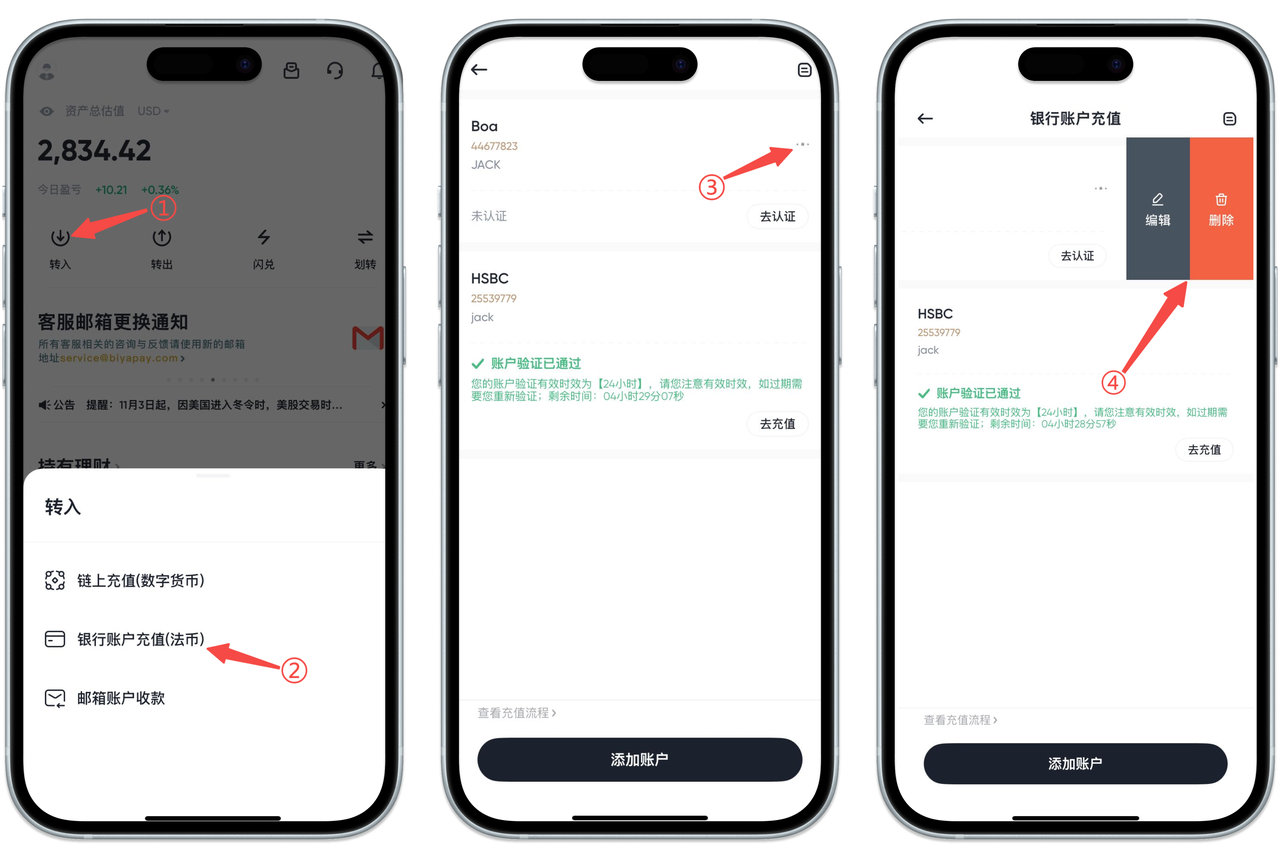 在app首页【转入】选择【银行账户充值(法币)】,然后点击付款人右侧的三个小点,即可删除或者编辑付款人账户。