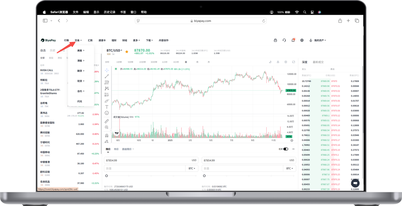 BiyaPay 目前支持交易美股、港股及期货,并提供数字货币现货与合约品种,为用户提供多市场、多品种的一站式交易体验。