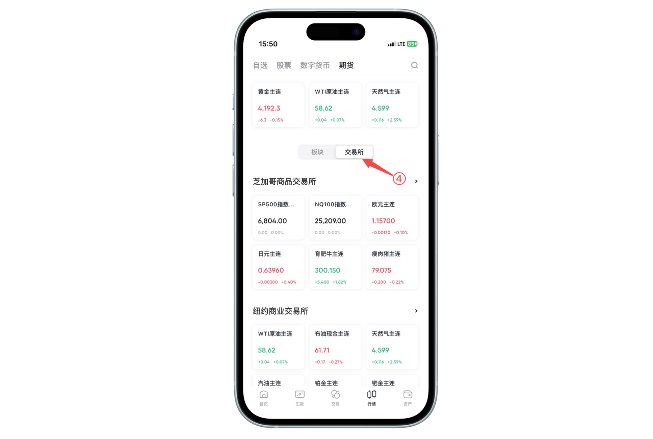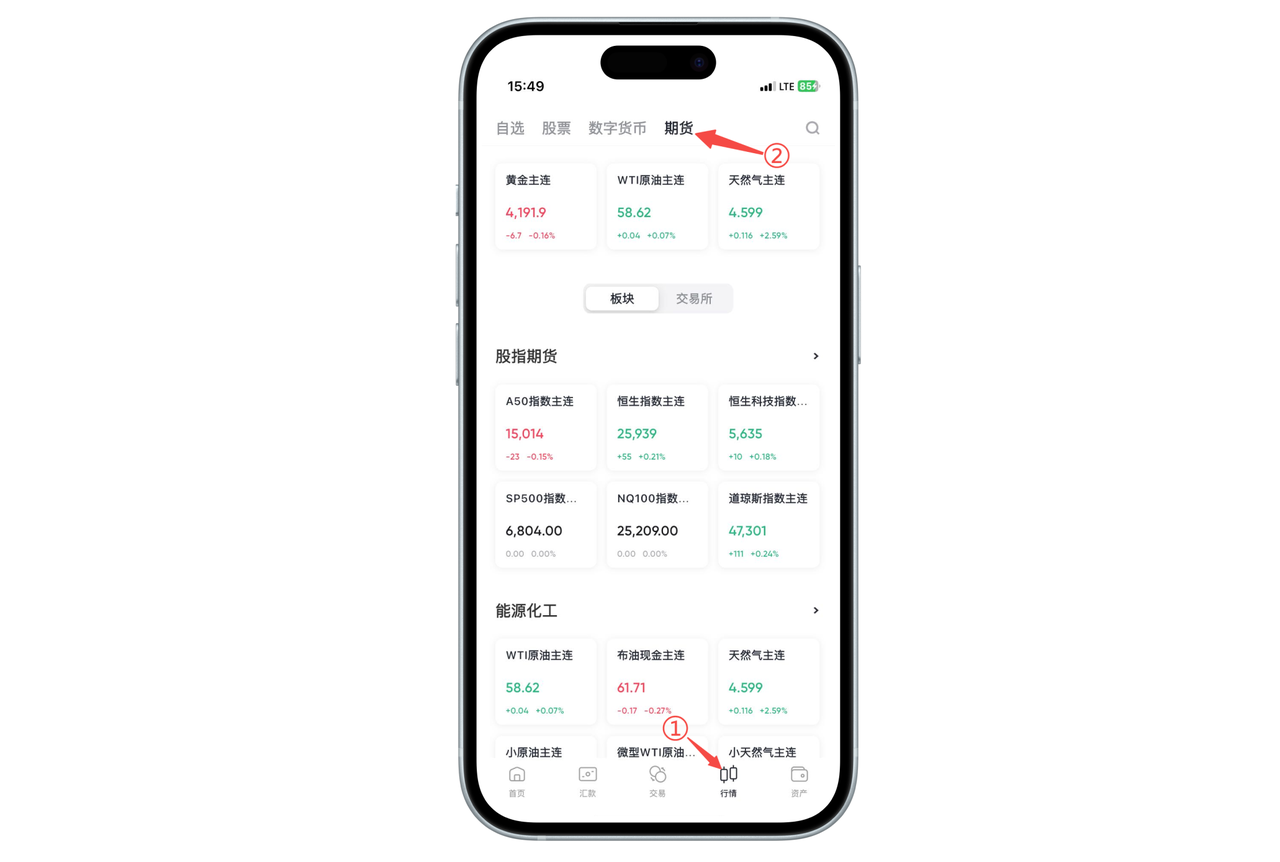 打开 App 底部导航栏中的【行情】,在顶部横向分类中滑动并点击【期货】,即可进入期货行情页面。